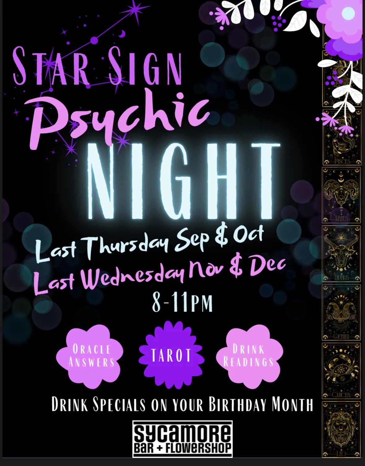 **November and December Star Sign Psychic Night will be on the LAST WEDNESDAY- Nov. 26 and Dec. 24 **